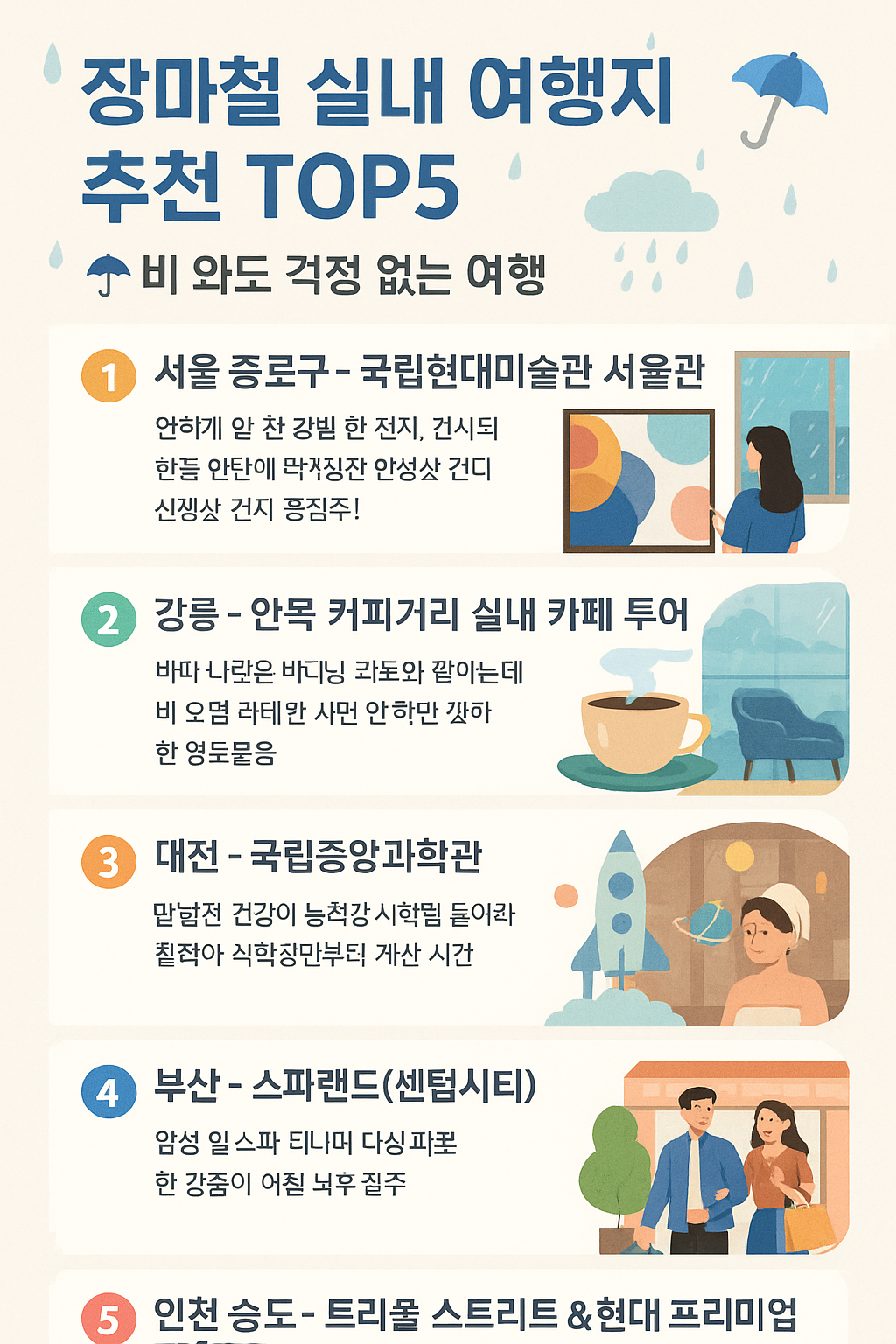 장마철 실내 여행지 추천 TOP5 ☔️ 비 와도 걱정 없이 떠나는 여정!